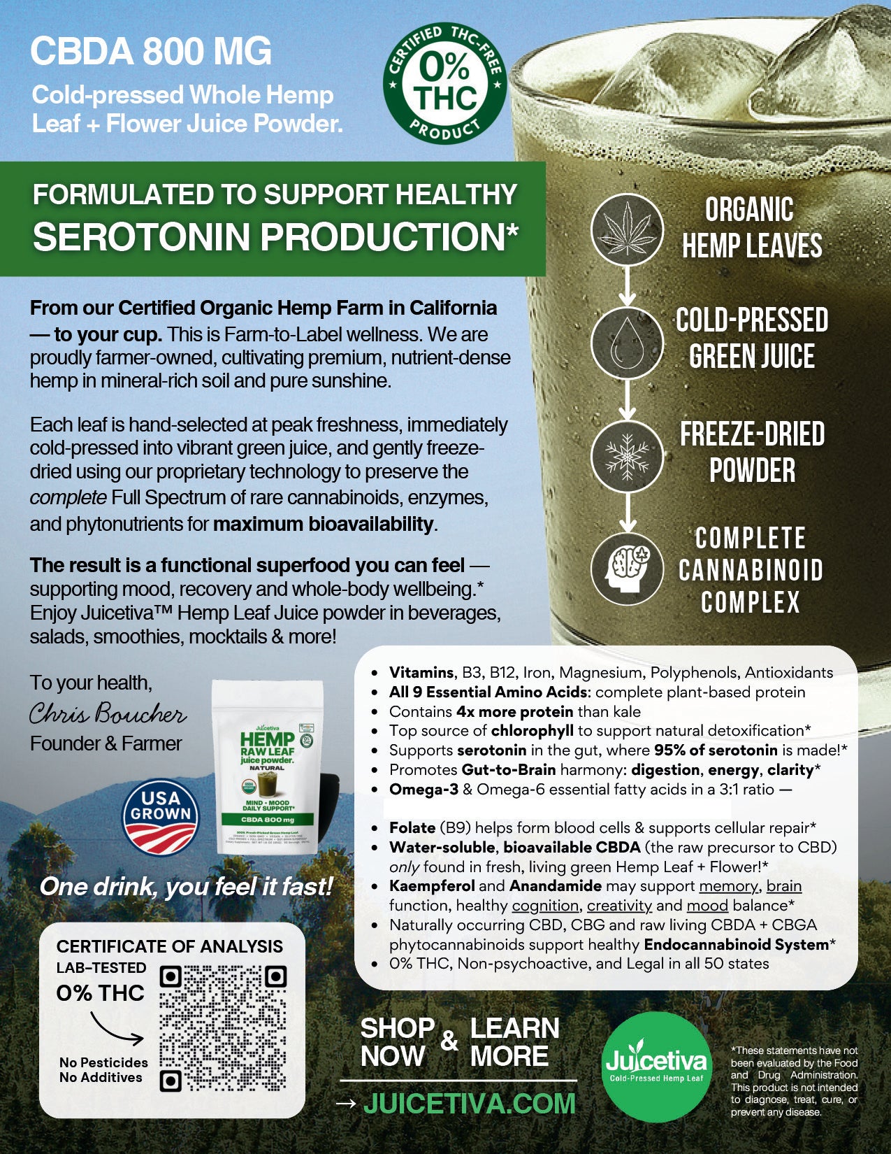 Juicetiva™ is a breakthrough hemp superfood for mood, memory and gut to brain health. Legal in All 50 States!