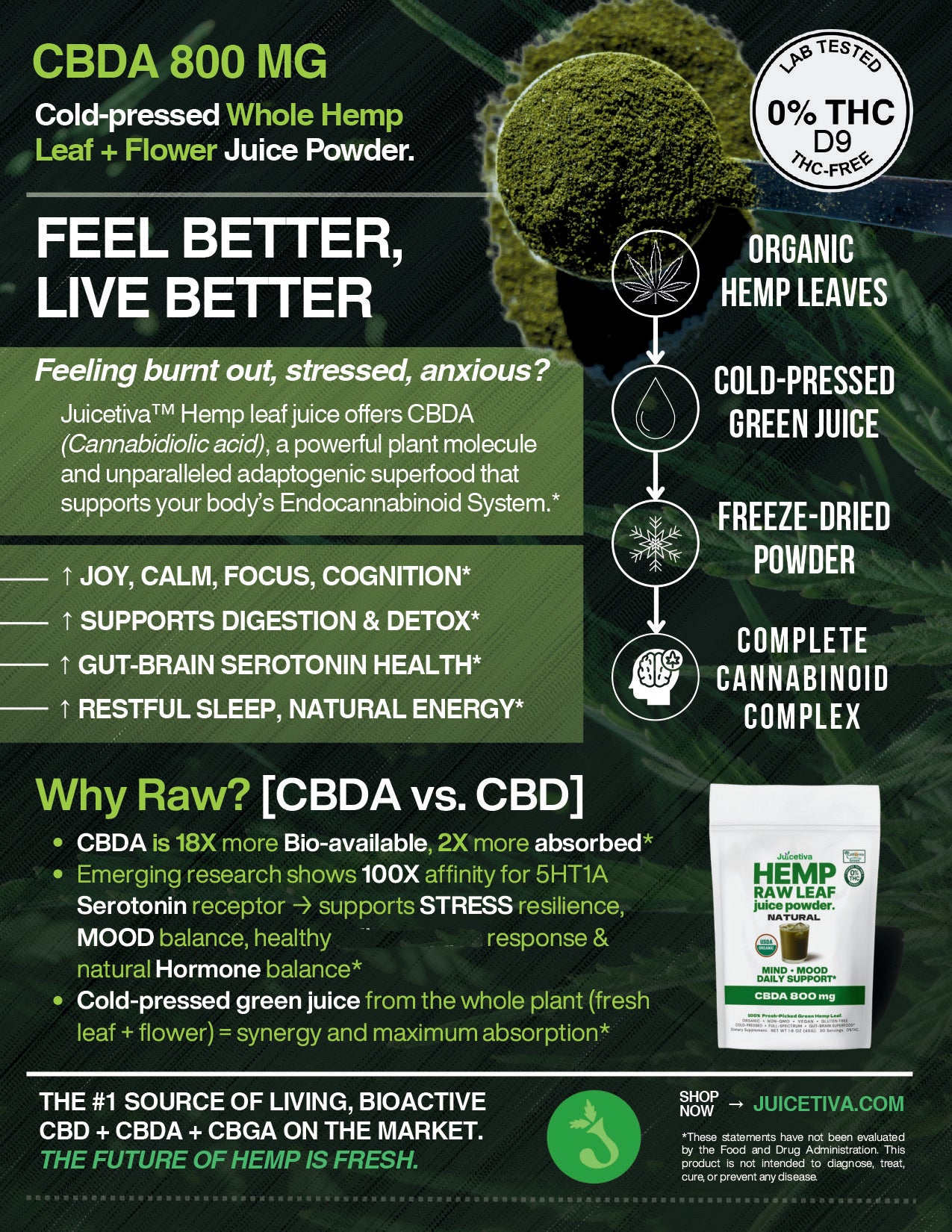 Juicetiva is a Freeze-dried 100% hemp leaf juice, a powdered CBDa CBD superfood made from cold-pressed juice extracted from fresh, organic hemp leaves and flowers. The process involves cryogenic freezing the raw juice followed by an 8-stage lyophilization (freeze-drying) under vacuum to remove moisture while preserving heat-sensitive nutrients, acidic cannabinoids like CBDA and CBGA, chlorophyll, vitamins, minerals, essential fatty acids (Omegas 3 and 6), all nine essential amino acids, prebiotic fiber, flavonoids, and over 100 bioactive compounds. This method avoids heat or solvents, ensuring the powder remains water-soluble, highly bioavailable,